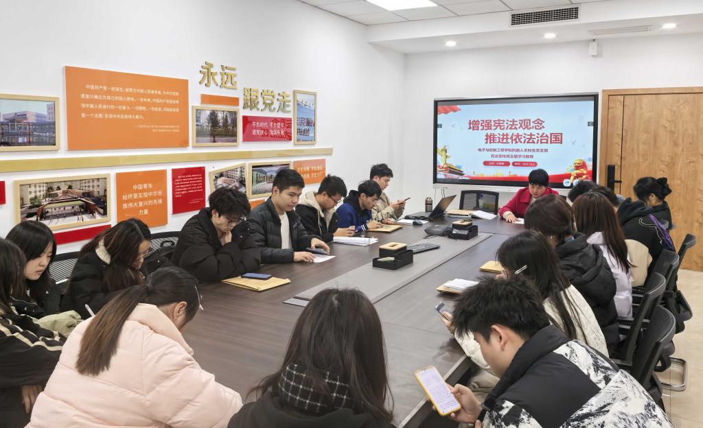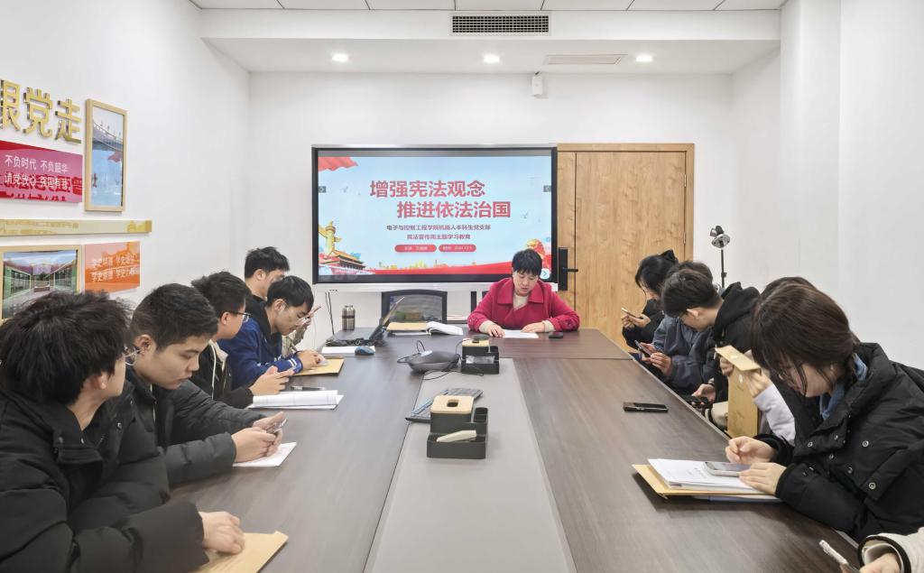 机器人本科生党支部在朝晖园一站式示范园区党团活动室举办“增强宪法观念,推进依法治国”主题党日活动。党支部书记王斌娟及全体支部党员参加活动。