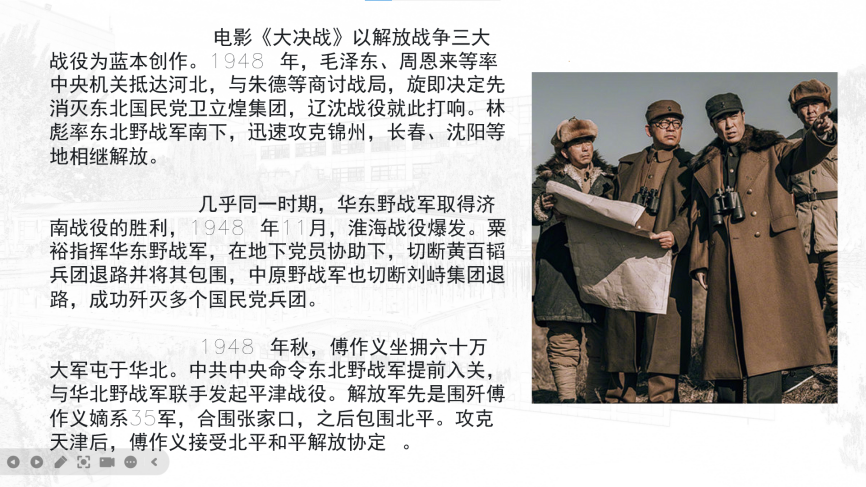 此次活动以电影《大决战》为切入点,电影以解放战争时期三大战役为蓝本创作。三大战役从1948年9月12日开始,到1949年1月31日结束,历时4个月零19天,共歼敌154万人,基本上消灭了长江以北国民党的军事主力,三大战役的胜利,为解放战争在全国的胜利奠定了坚实基础。