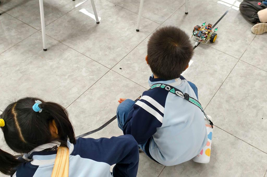 在“智慧车轮”展区,志愿者在地面布置黑色循迹带,演示光电传感器如何引导小车自主行驶。小朋友通过更换彩色胶带观察路径变化,初步理解“传感器-判断-执行”的自动化逻辑。