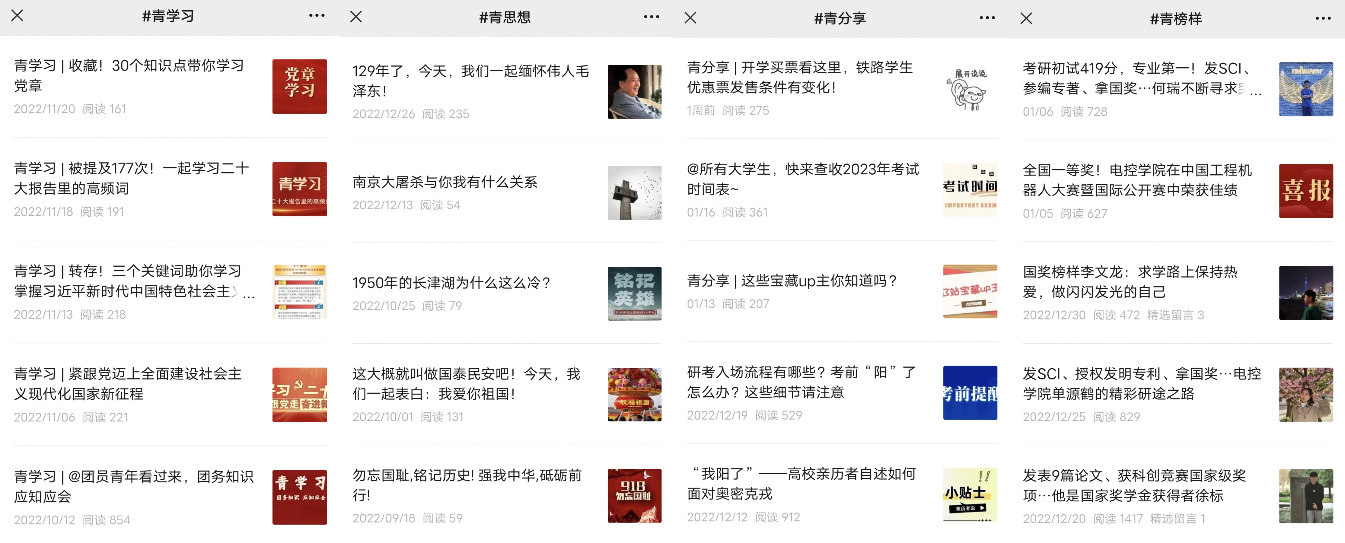 加强工作设计谋划,打造电控特色品牌。“点控未来”公众号关注人数近4800人,每周推文10-12篇,年度推文568篇,图文阅读总量483213次。发布内容聚焦立德树人根本任务,积极宣传学院党群工作、教学科研、学科建设、学生工作、榜样故事、文化活动等内容,逐步形成了以“聚焦电控”“活力电控”“青春电控”为主要版块的具有电控特色的公众号品牌,公众号排名稳定在院系排行榜前三,并多次位列第一。