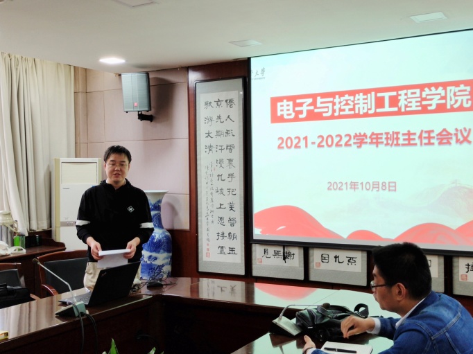 于2021年10月8日下午在南校区学术交流中心第五会议室召开2021-2022学年班主任工作会议。全体学院领导班子成员、学办辅导员、各年级班主任及思政班主任参加会议,会议由院党委副书记赵丹主持。