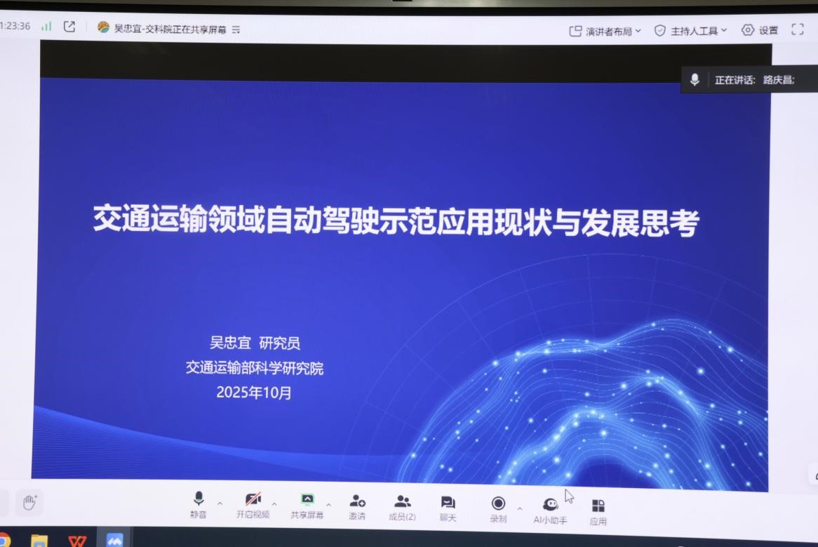 于WM3404教室举办“交通运输领域自动驾驶示范应用现状与发展思考”学术讲座——“电控讲坛”第5期。本次线上讲座由学院副院长路庆昌主持,特邀交通运输部科学研究院研究员吴忠宜作为主讲嘉宾。