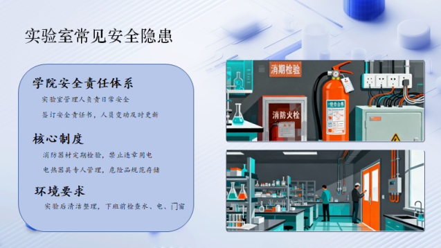 她以图文并茂的方式详解消防器材定期检验流程,剖析违章用电、危险品存储不规范等典型安全隐患,用“反面教材”筑牢制度红线;针对电子类实验室仪器密集、用电需求大的特点,着重强调用电安全与设备操作规范。活动还聚焦实验后清洁整理等细节,通过互动问答邀请同学们分享实验室亲身经历,进一步强化“细节决定安全”的理念。