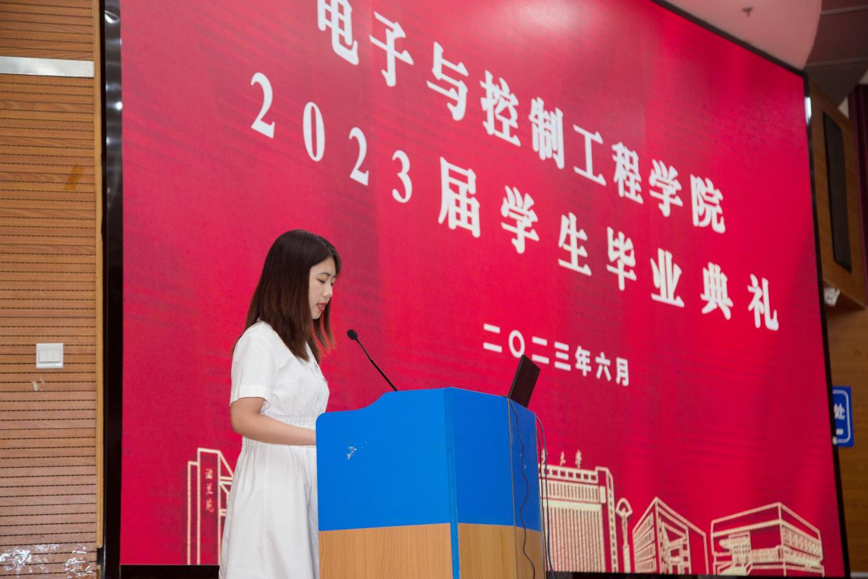 教师代表、电工电子基础教学部及实验教学中心党支部书记杨丽媛在发言中深情回顾了同学们在校的成长经历,向同学们表达了真诚的祝福与期望,勉励同学们砥砺创新、勇担使命,将个人成长与国家命运紧密相连。