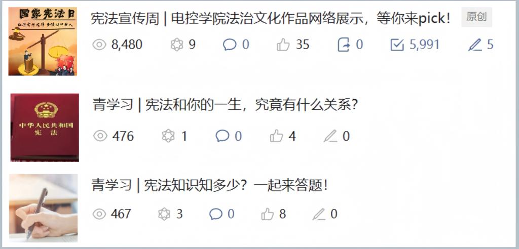 关于实施“宪法卫士”行动计划的通知,制定学院“宪法卫士”行动计划实施方案,学院学生积极参加教育部全国青少年普法网“宪法卫士”学习活动,参与率达100%,形成了比学赶超的良好氛围;学院利用“点控未来”新媒体平台,通过微信推送、网络答题等多种形式开展宪法知识学习,发布“青学习”“青思想”法治宣传教育系列文章,引导师生切实做到心中有法、谋事尊法、行为依法,相关推文阅读次数累计达1万余次。