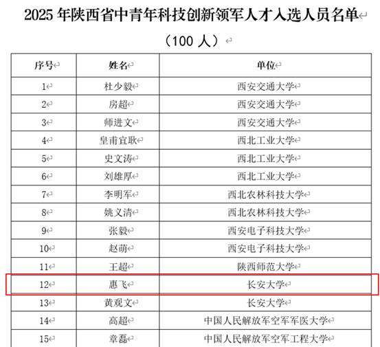 近日,陕西省科学技术厅发布了《关于公布2025年陕西省中青年科技创新领军人才、科技创新创业人才及2026年青年科技新星入选人员的通知》(陕科人才函〔2025〕355号),成人有声小说 惠飞教授入选2025年陕西省中青年科技创新领军人才。